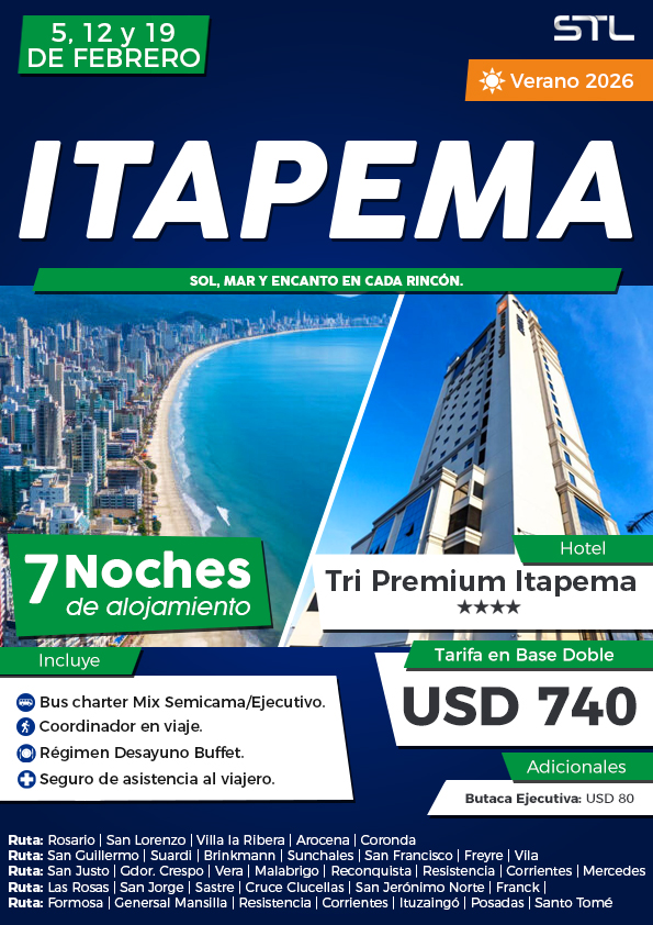 Tarifas válidas Diciembre 2025 a Abril 2026, expresadas en dólares USA por pasajero, para residentes (*extranjeros consultar), más impuestos y percepcione, en base, régimen y hoteles según elección, sujeta a cambios sin previo aviso.