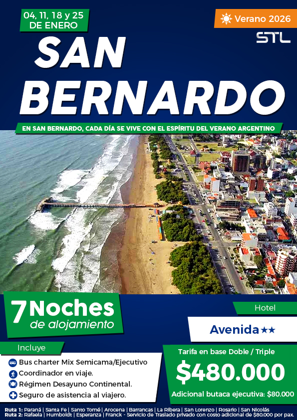 San Bernardo te espera con playas extensas, un centro lleno de vida y el encanto clásico de la Costa Atlántica. Es el lugar ideal para disfrutar del sol, caminar por la peatonal, vivir noches animadas y sentir la frescura del mar en cada momento de tus vacaciones.